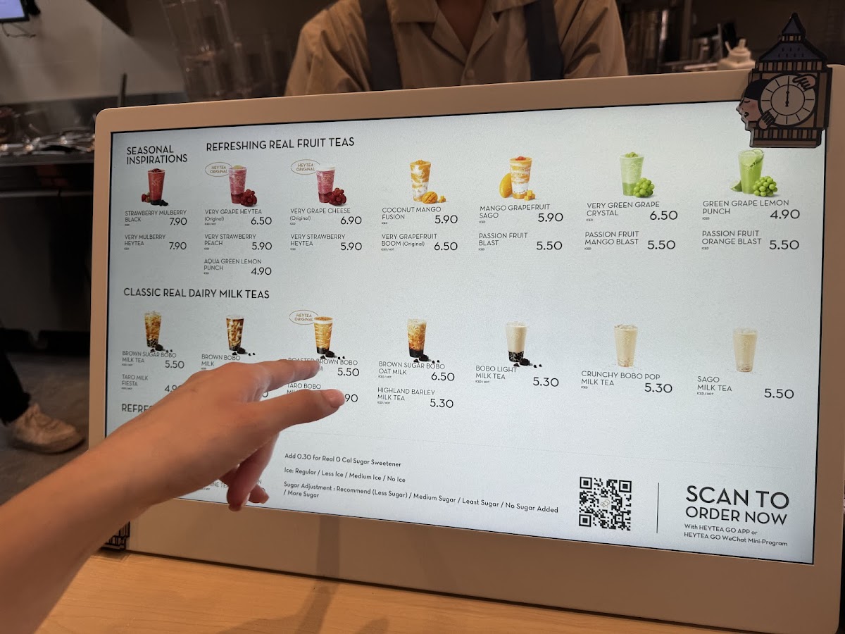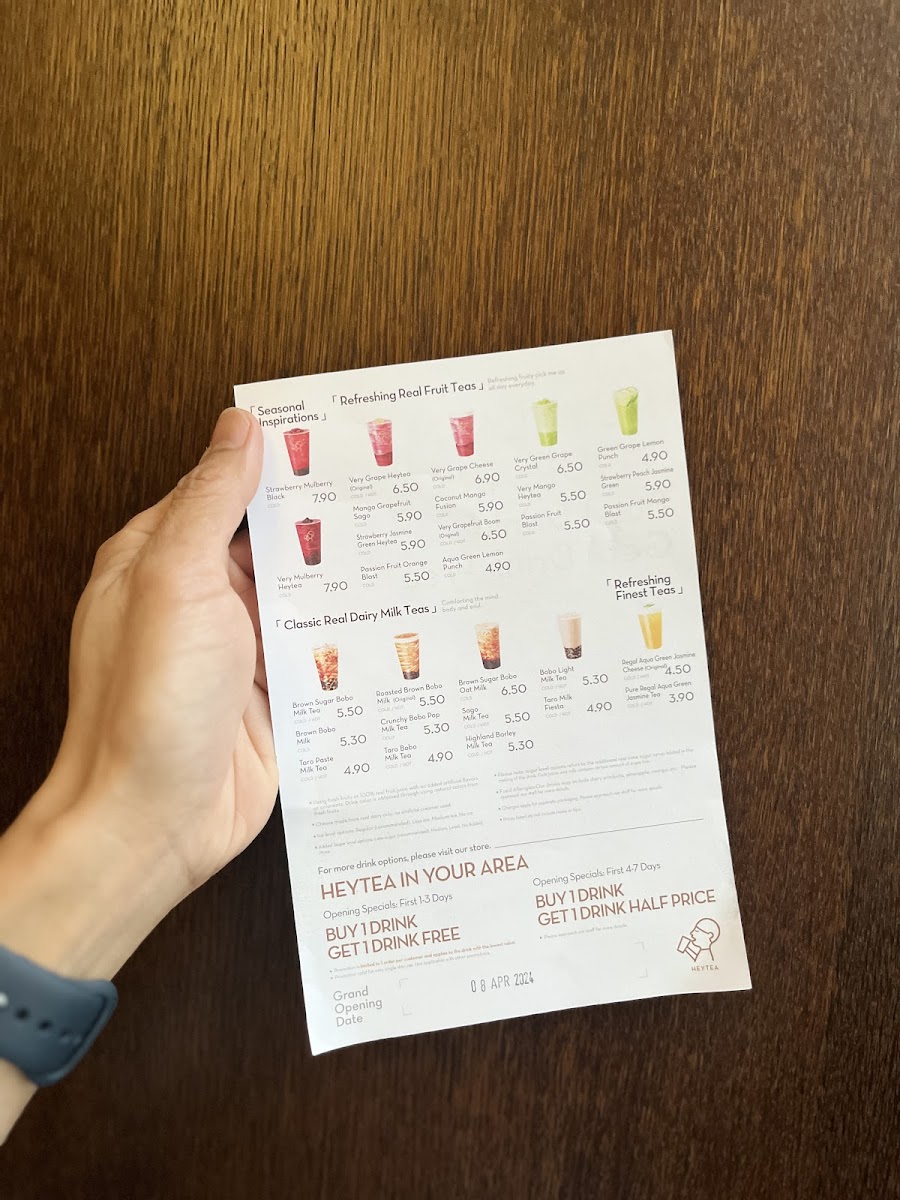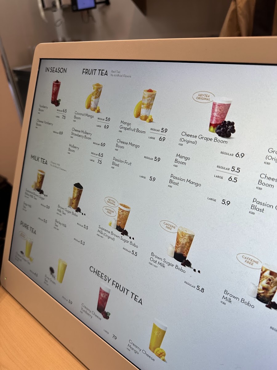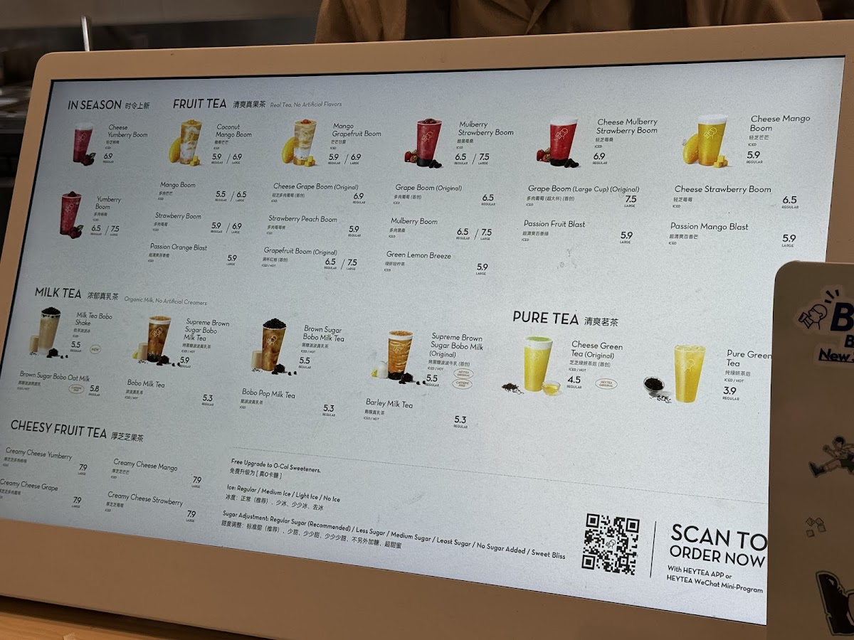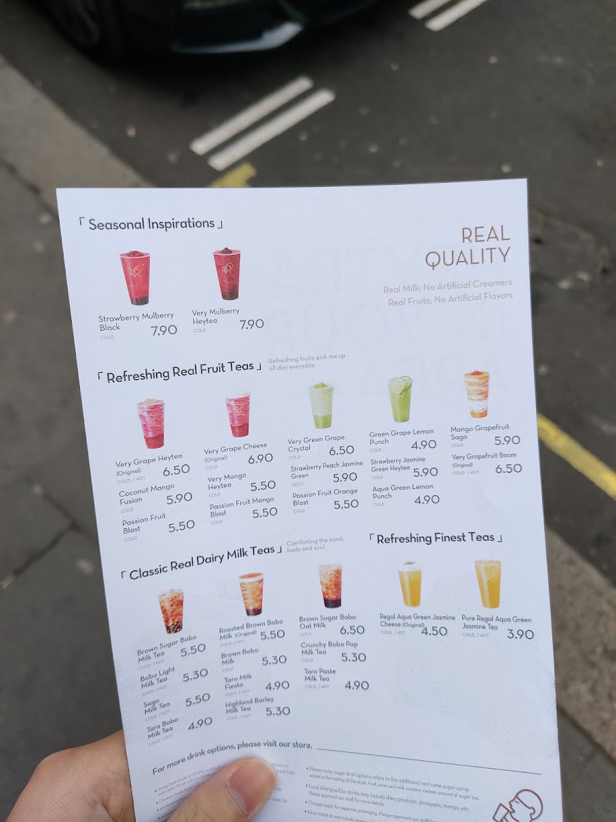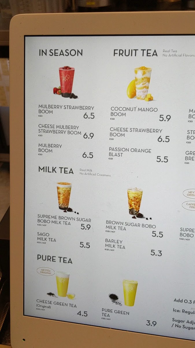 The menu at HEYTEA (Mayfair) features a diverse selection of specialty beverages primarily focused on tea-based drinks. The offerings are organized into distinct categories including Staff Picks, Fruit Tea, and Bobo Milk Tea, each showcasing unique flavor combinations and signature ingredients.