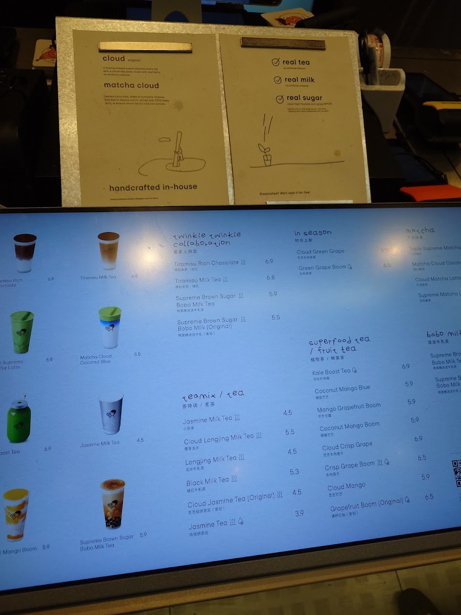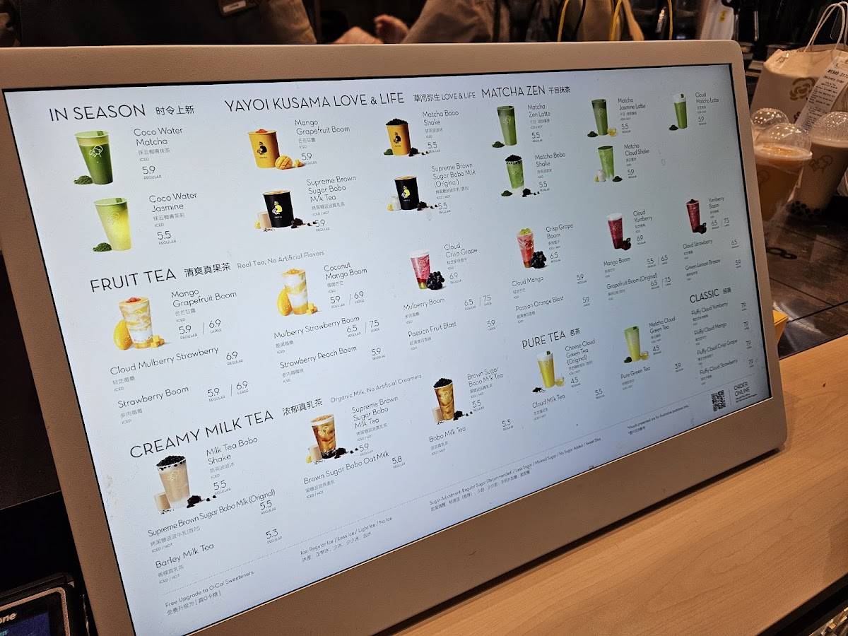 Fruit Tea options highlight combinations of fresh fruits and tea, such as the Grapefruit Boom and Cloud Mango, blending real fruit pieces like grapefruit and mango with various teas and cheese clouds where applicable.